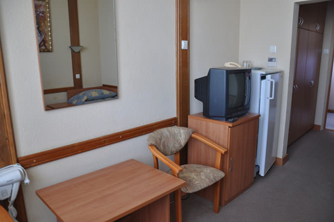 В комплектацию входят чайник, набор посуды, телевизор, кондиционер и холодильник. Из мебели имеются тумбы, столик, зеркало и стулья.