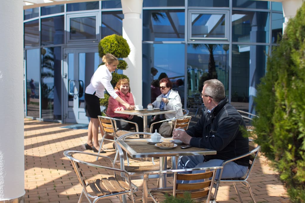 Питание проходит в 3 обеденных залах столовой по системе «Шведский стол» или кафе на собственном пляже, который растянулся на 500 метров и оборудован лежаками и зонтиками.